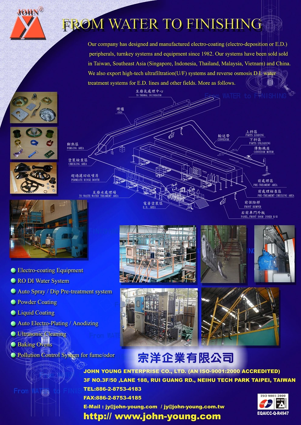 Our company has designed and manufactured electro-coating (electro-deposition or E.D.) peripherals, turnkey systems and equipment since 1982. Our systems have been sold sold in Taiwan, Southeast Asia (Singapore, Indonesia, Thailand, Malaysia, Vietnam) and China. We also export high-tech ultrafiltration(U/F) systems and reverse osmosis D.I. water treatment systems for E.D. lines and other fields. More as follows.